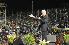 A large group sat on the grass listening in the dark at another soccer field down the road. On the only night the people at this second football field were counted, there were 5,000 sitting there. The local conference hastily erected a giant screen so those at the second field could see the pictures that those inside could see. This effectively meant the program ran at two venues simultaneously. When altar calls were made, people ran from the second football field to the main stadium to make a commitment.