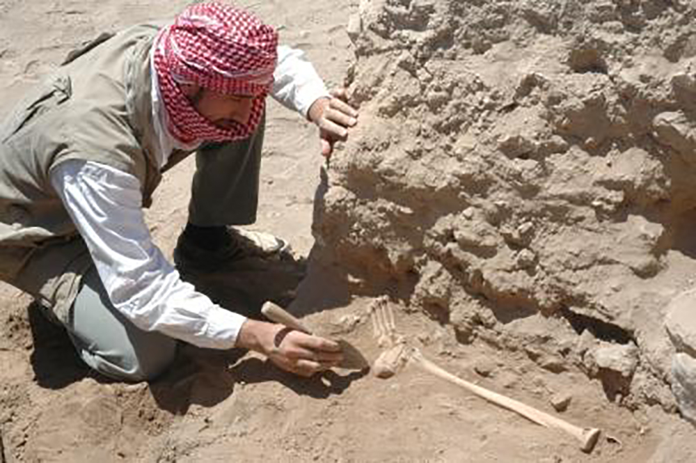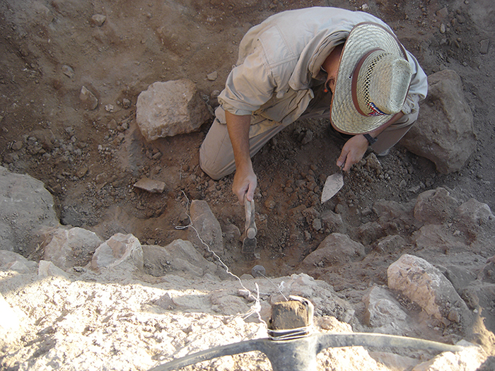 Dr. Efraín Velázquez, works at a human burial in an Ammonite city in 2000, at Tall Jalul, Jordan during Andrews University Madaba Plains Project. [Photo: Courtesy of Efrain Velázquez]