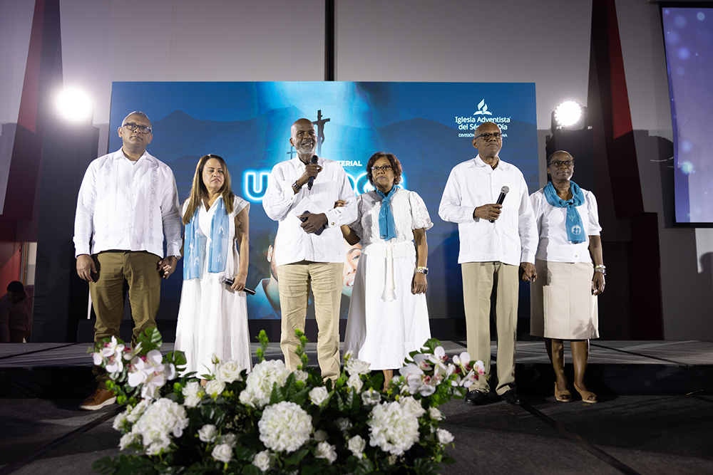 IAD President Pastor Elie Henry (third from left) speaks to the pastoral delegation next to his wife Ketlie, and fellow administrators from left to right: Roberto Herrera, stewardship director, Ivelisse Herrera, treasurer, Leonard Johnson, executive secretary, and wife Denise, during the last day of the final night of the ministerial retreat in El Salvador, Sep. 18, 2024. [Photo: Daniel Gallardo/IAD]