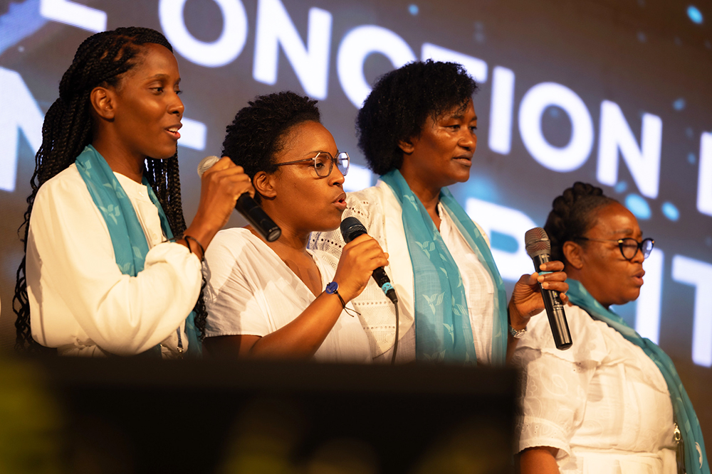 Pastoral wives from the French Antilles Guiana Union lead in singing the theme song in French during morning segment on stage.[Photo: Daniel Gallardo/IAD]
