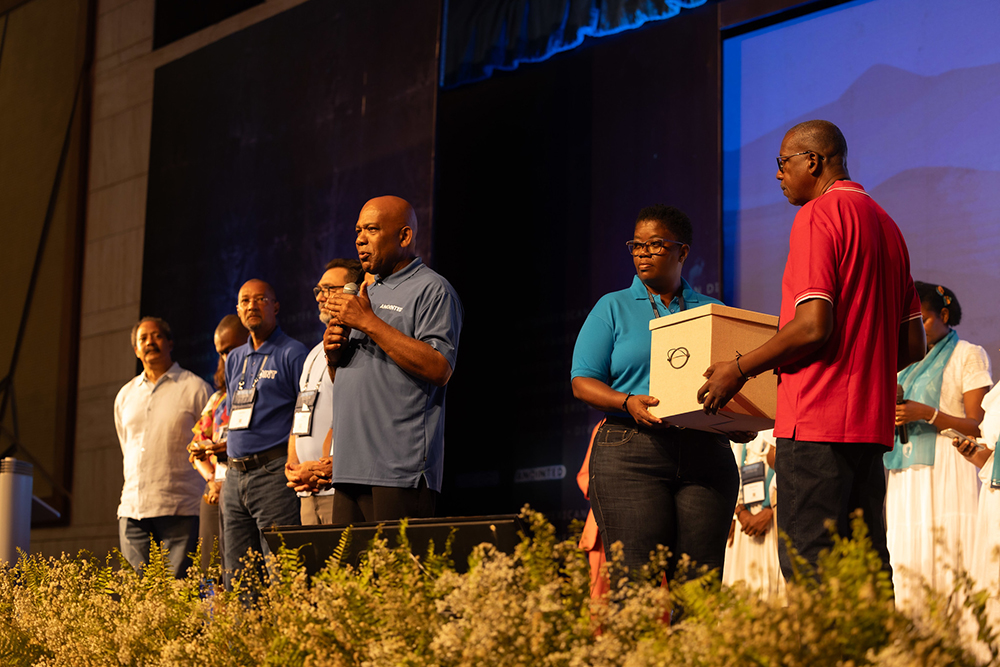 Pastor Samuel Telemaque, Sabbath School director of the IAD, reports on the special prayer room that saw hundreds of prayer requests placed on a special box during the ministerial retreat. [Photo: Daniel Gallardo/IAD]