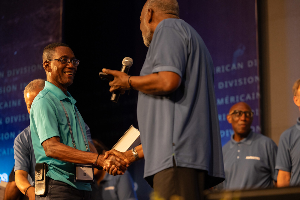 Pastor Ramon Canals, ministerial association secretary of the General Conference congratulates Claudy Retel of the French Antilles Guiana Union for his years of service in the church. [Photo: Daniel Gallardo/IAD]