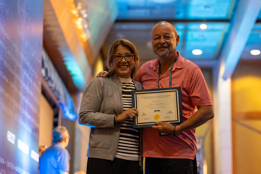 Pastor Max and Mary Martínez of the North Puerto Rico Conference show their certification after being recognized on stage for tier 41 years of service in their home country. [Photo: Daniel Gallardo/IAD]