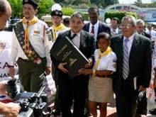 Cientos de dirigentes de iglesia, miembros, Conquistadores y Guías Mayores se reunieron en el Aeropuerto Juan Santa María para presenciar y celebrar el arribo de la Biblia especial, el 4 de diciembre, 2009, en su parada 111 alrededor del mundo.