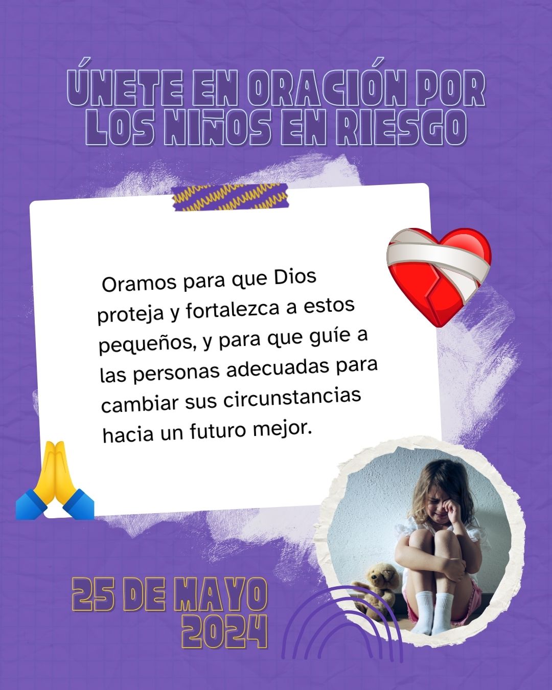 Extendemos una invitación especial para este 25 de mayo de 2024 📅. Todas las iglesias alrededor del mundo se unen durante la hora del culto para orar fervientemente por los niños que están en riesgo y solos, ya sea por abandono o por descuido de sus cuidadores. Oramos para que Dios proteja y fortalezca a estos pequeños, y para que guíe a las personas adecuadas para cambiar sus circunstancias hacia un futuro mejor. Que nuestras oraciones sean un refugio y una esperanza para estos corazones jóvenes que enfrentan desafíos más allá de su control.