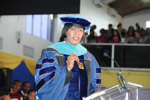Le Premier Ministre Simpson Miller s'est vue décerner le titre de Docteur en Service Public lors de la première cérémonie de remise de diplômes où elle était l'intervenante principale.